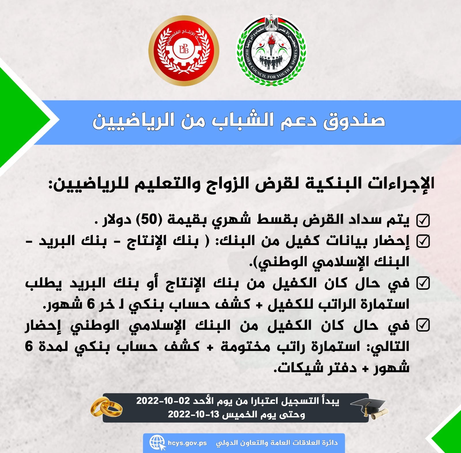 يذكر أن قرض الزواج تبلغ قيمته (١٥٠٠) دولار، بينما قرض التعليم (٥٠٠) دولار، حيث تم تعميم الشروط على الأندية والاتحادات الرياضية وإرسال نماذج الطلبات، على أن تتولى الأندية والاتحادات استقبال الراغبين في الاستفادة من القرض وإرسال الكشوفات بأسماء المستفيدين وفقا للشروط حتى يتم اعتمادها من المجلس الأعلى ومن ثم البدء بالإجراءات البنكية.